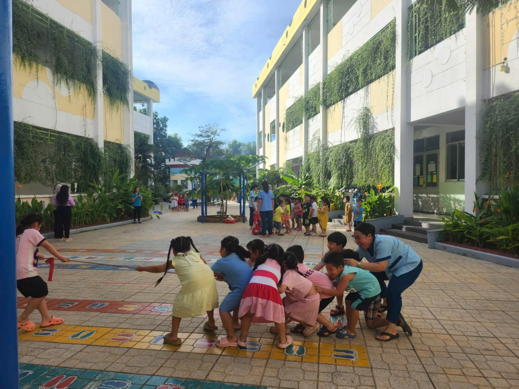 Nhóm trẻ đang chơi kéo co rất sôi nổi trong sân Trường Mầm non Mặt Trời Nhỏ. Ảnh: NGUYỄN QUYÊN