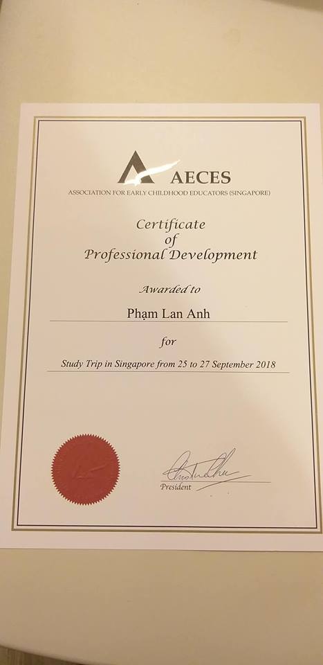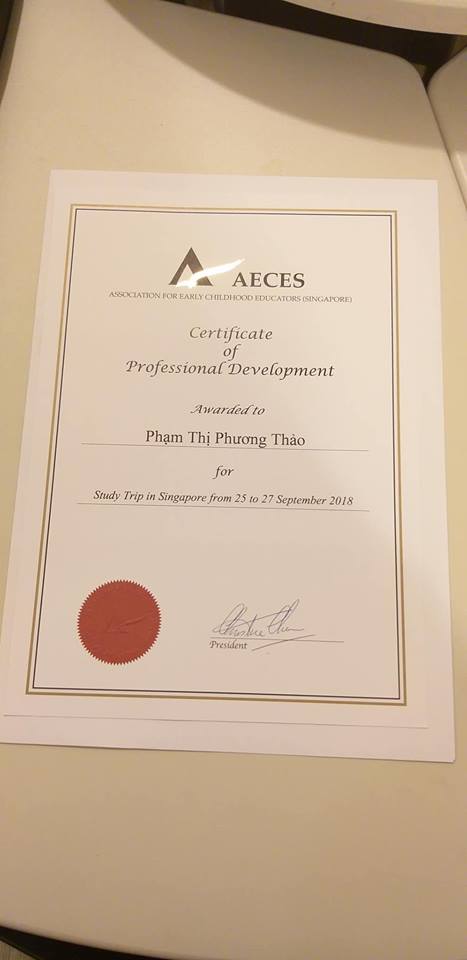 Cũng trong đợt công tác này tại Singapore, Ban giám hiệu trường MN Thanh Bình đã có cơ hội trải nghiệm khóa đào tạo với cô Fiona- Hiệu trưởng trường MN Chiltern House và tới trường MN My First Skool - một trong những trường MN công lập lớn nhất tại Singapore. Qua đợt học tập và trải qua các hội thảo, cùng các đánh giá, chia sẻ, các bài thuyết trình, BGH Thanh Bình đã nhận được chứng chỉ tập huấn do TS Chen trực tiếp trao tặng và quan trọng hơn cả là đã có những trải nghiệm quý giá tại một đất nước tiên tiến có nền giáo dục phát triển bậc nhất trên thế giới để ngày càng hoàn thiện nâng cao chất lượng đội ngũ, quyết tâm tập trung toàn lực để phát triển và đem đến cho các bé yêu cũng như các cô giáo trường MN Thanh Bình 1 môi trường học tập, làm việc tích cực, thân thiện và năng động.